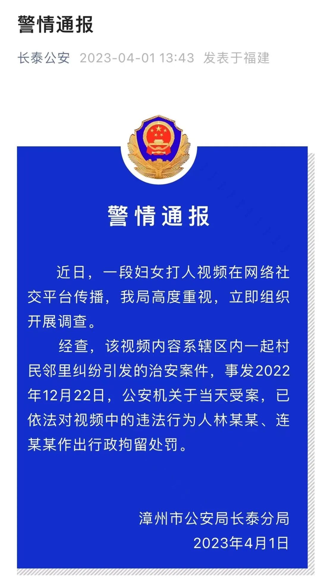经查,该视频内容系辖区内一起村民邻里纠纷引发的治安案件,事发2022年12月22日,公安机关于当天受案,已依法对视频中的违法行为人林某某、连某某作出行政拘留处罚。