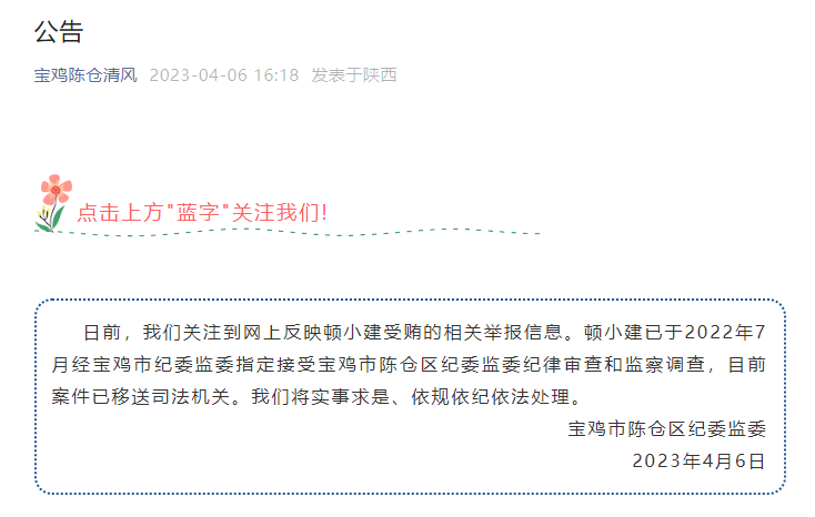 宝鸡市陈仓区*****监委6日发布公告: 日前,我们关注到网上反映顿小建受贿的相关举报信息。顿小建已于2022年7月经宝鸡市*****监委指定接受宝鸡市陈仓区*****监委纪律审查和监察调查,目前案件已移送司法机关。我们将实事求是、依规依纪依法处理。