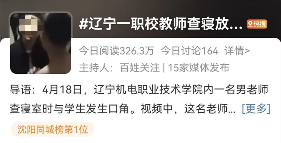 4月18日, 辽宁机电职业技术学院内 一名男老师查寝室时与学生发生口角。 视频中,这名老师推搡学生, 不断用手指向在场的男同学, 问谁不服。