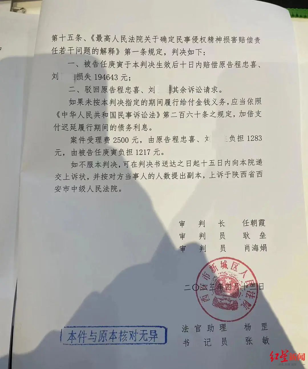 2023年5月8日,记者从权威渠道获悉,因1900元租金引发20岁女大学生和70多岁房东骂战的致死案,一审判决已出炉:西安市新城区法院一审判决显示,房东任庚寅被判赔偿女大学生程培的父母194643元。