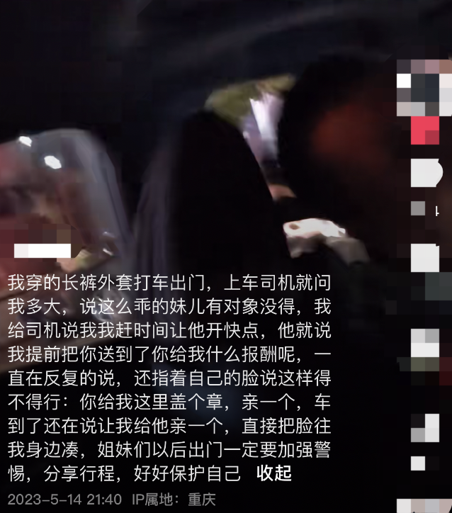 女子晚上独自打车被司机骚扰她发视频曝光 反而被网友质疑“是不是穿着有问题?” 这种质疑实在让人愤怒 [font=mp-quote, -apple-system-font, blinkmacsystemfont, "]近日,重庆一女子乘坐网约车被骚扰的视频引发网友热议。当事人发布的视频中,司机明明已经把车开到了目的地,但依然不肯停车。[font=mp-quote, -apple-system-font, blinkmacsystemfont, "]