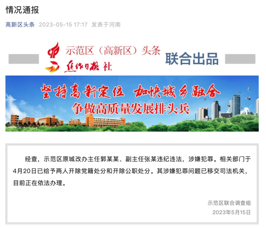 5月15日,河南省焦作市高新技术产业开发区官方微信公众号“高新区头条”发布情况通报:经查,示范区原城改办主任郭某某、副主任张某违纪违法,涉嫌犯罪。相关部门于4月20日已给予两人开除党籍处分和开除公职处分。其涉嫌犯罪问题已移交司法机关,目前正在依法办理。