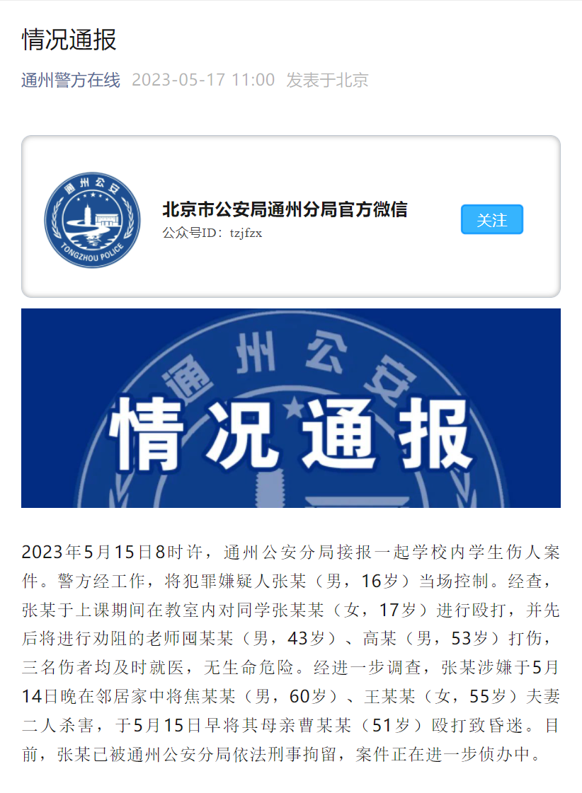 2023年5月15日8时许,通州公安分局接报一起学校内学生伤人案件。 “通州警方在线”发布通报: 警方经工作,将犯罪嫌疑人张某(男,16岁)当场控制。经查,张某于上课期间在教室内对同学张某某(女,17岁)进行殴打,并先后将进行劝阻的老师囤某某(男,43岁)、高某(男,53岁)打伤,三名伤者均及时就医,无生命危险。 经进一步调查,张某涉嫌于5月14日晚在邻居家中将焦某某(男,60岁)、王某某(女,55岁)夫妻二人杀害,于5月15日早将其母亲曹某某(51岁)殴打致昏迷。目前,张某已被通州公安分局依法刑事拘留,案件正在进一步侦办中。